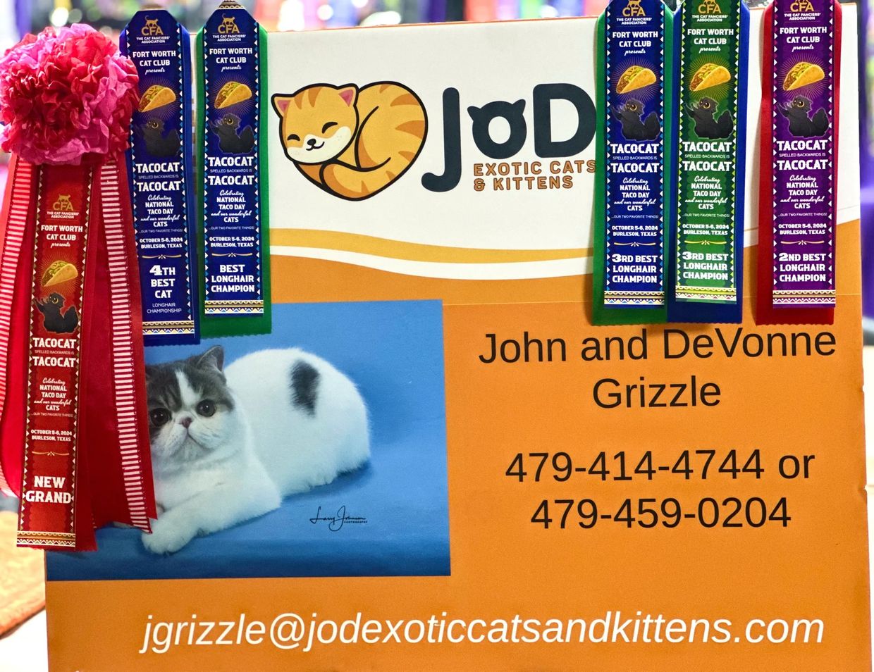 JoD Exotic Cats & Kittens, established in 2020, is a family-owned and operated business located in Fort Smith, Arkansas who specialize in the breeding and raising of CFA-registered Exotic SH (Short Haired) cats and kittens. Our kittens have happy loving new families in Arkansas, Oklahoma, Texas, Missouri, Florida, Illinois, Oregon, Utah, Virginia, Ohio, New Mexico, Tennessee, Louisiana, Indiana, Arizona, Maine, Kansas, and Pennsylvania.